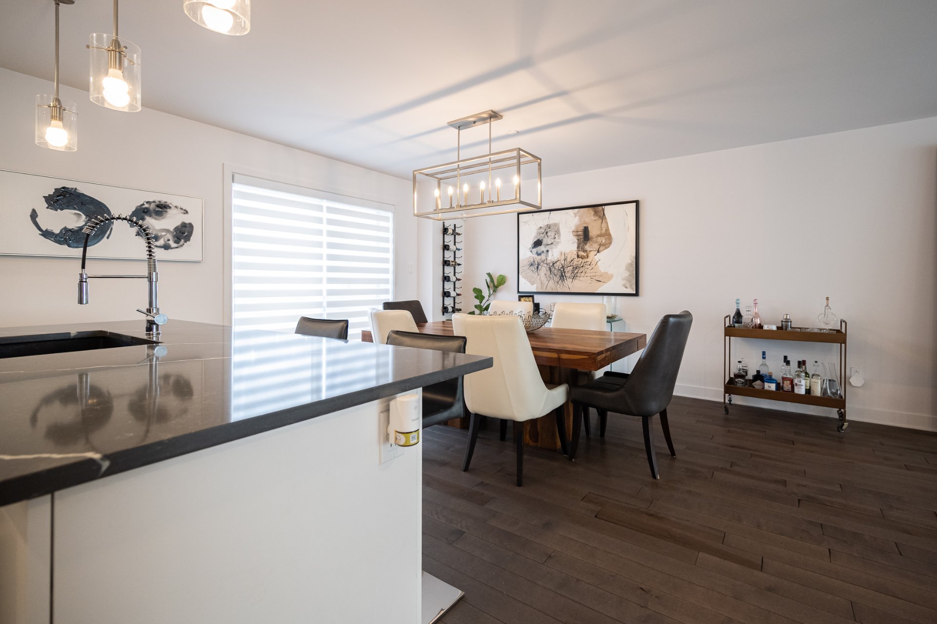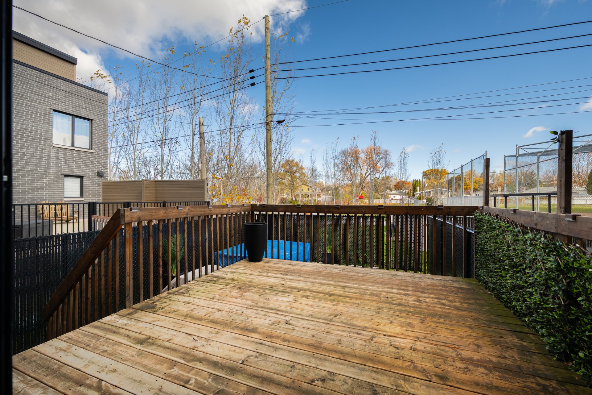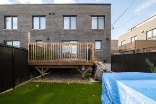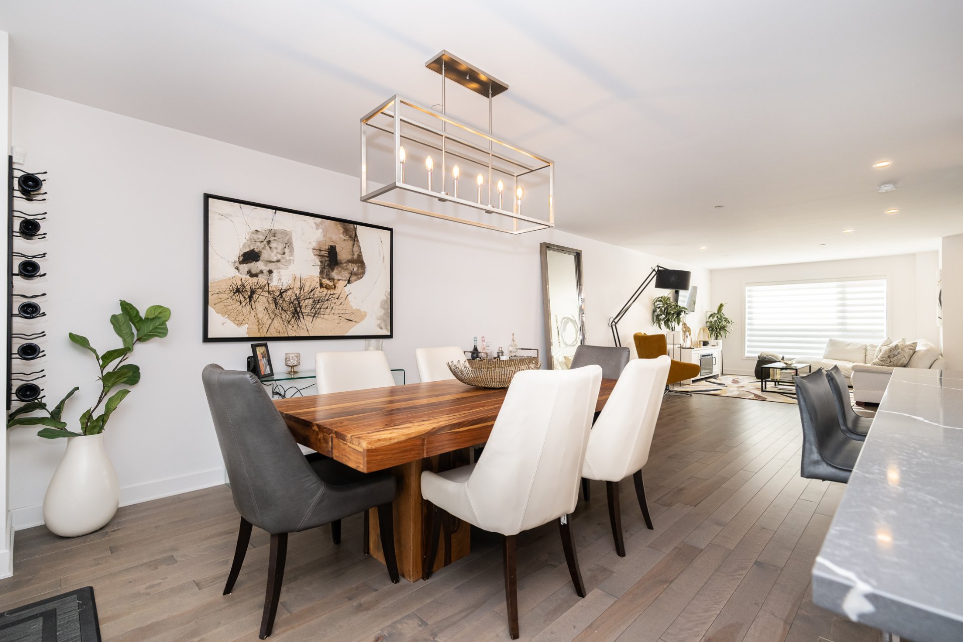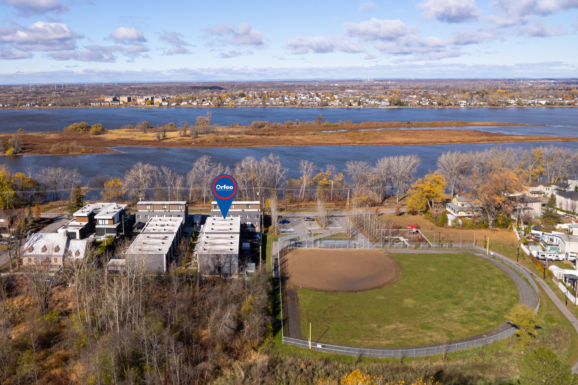 Beautiful modern 3-storey townhouse with finished basement and private double garage, built in 2019. Offers 3 spacious bedrooms, 2 full bathrooms plus powder room, separate laundry room and open-concept living filled with natural light. Elegant kitchen with black quartz island, hardwood floors and high-end finishes throughout. Large terrace with spa overlooking park and baseball field. Central heat pump, air exchanger, central vacuum and sprinkler system. Ideally located near the A25 bridge, schools, shops, cafés, parks, gym and all essential services in peaceful RDP by the river.