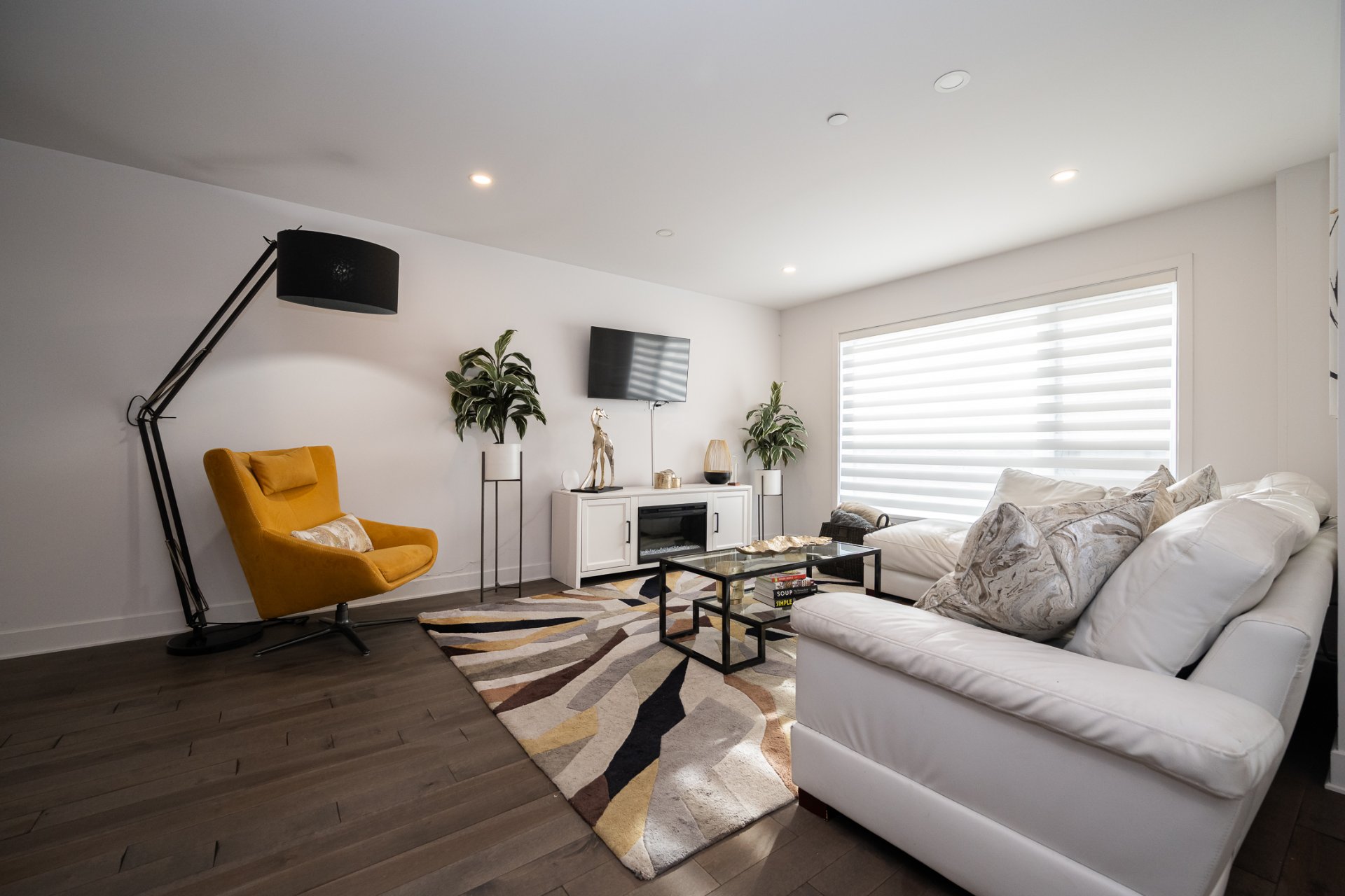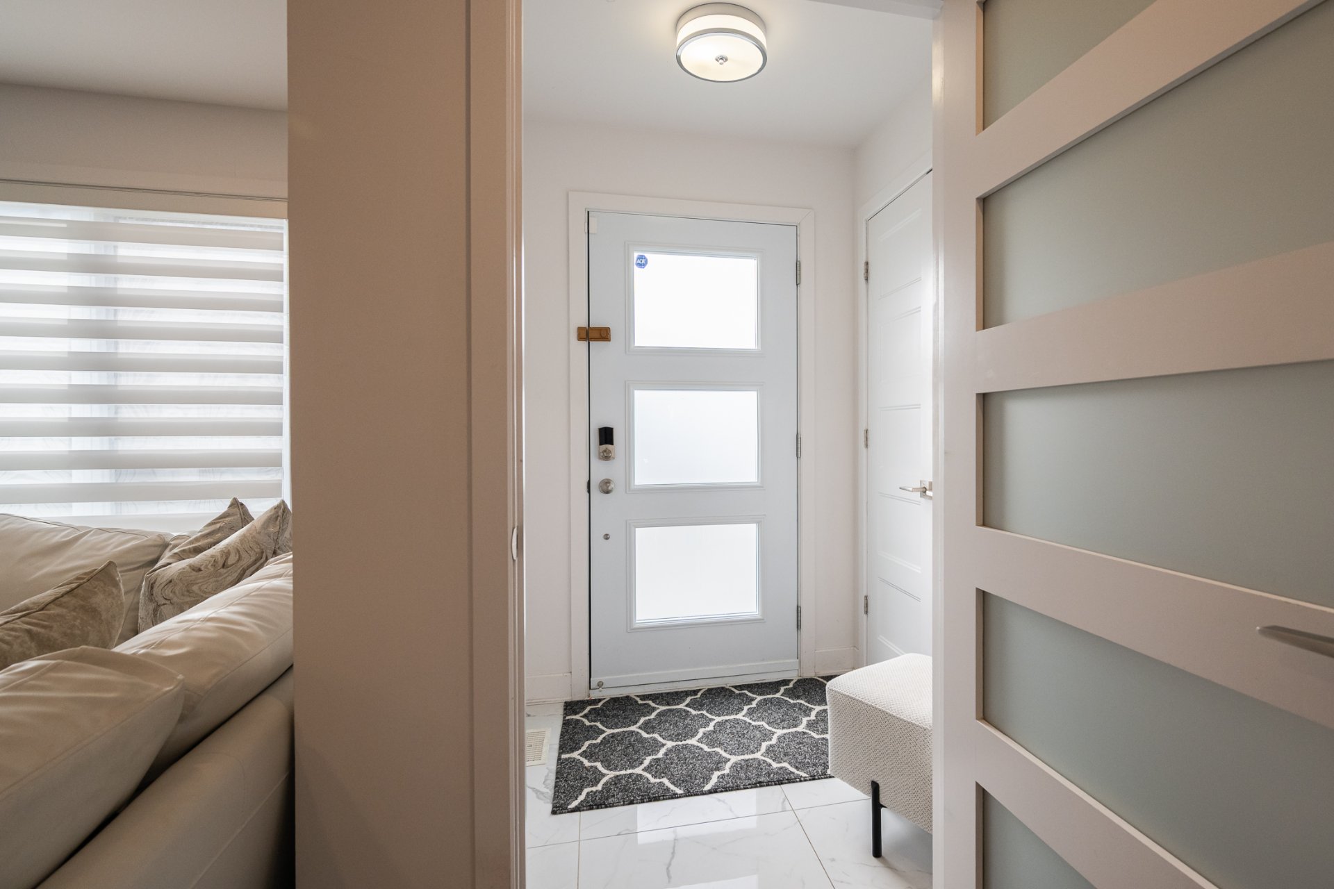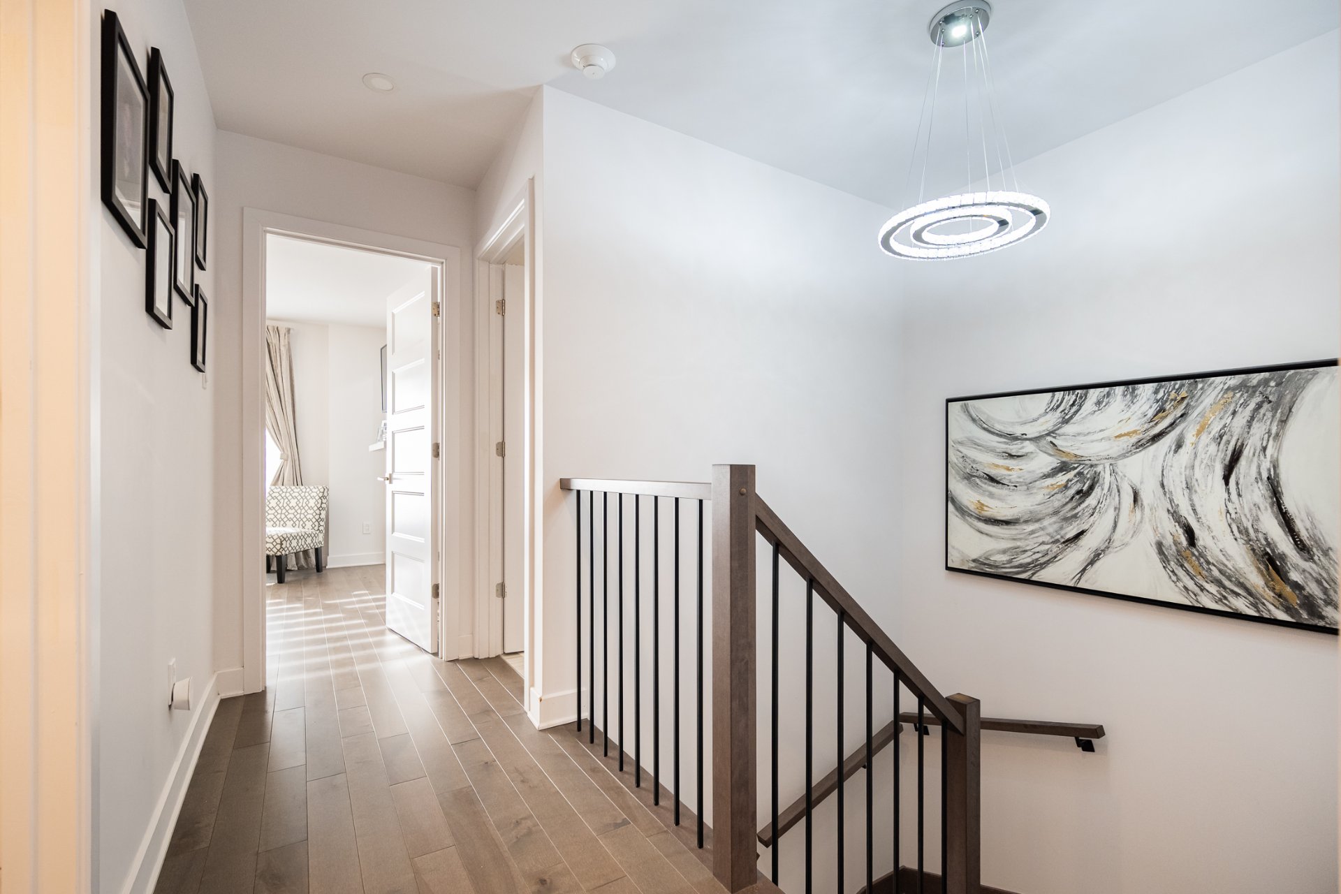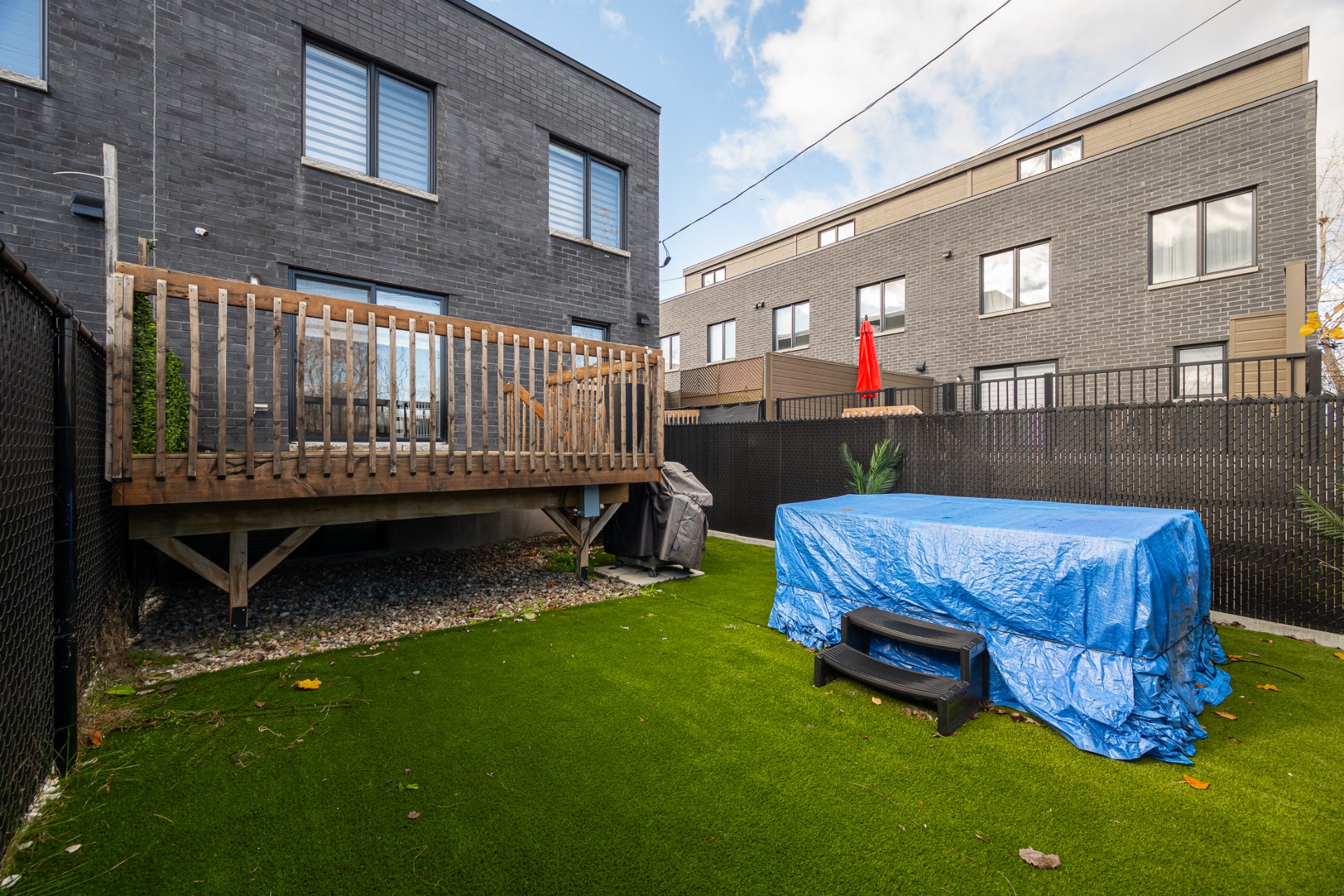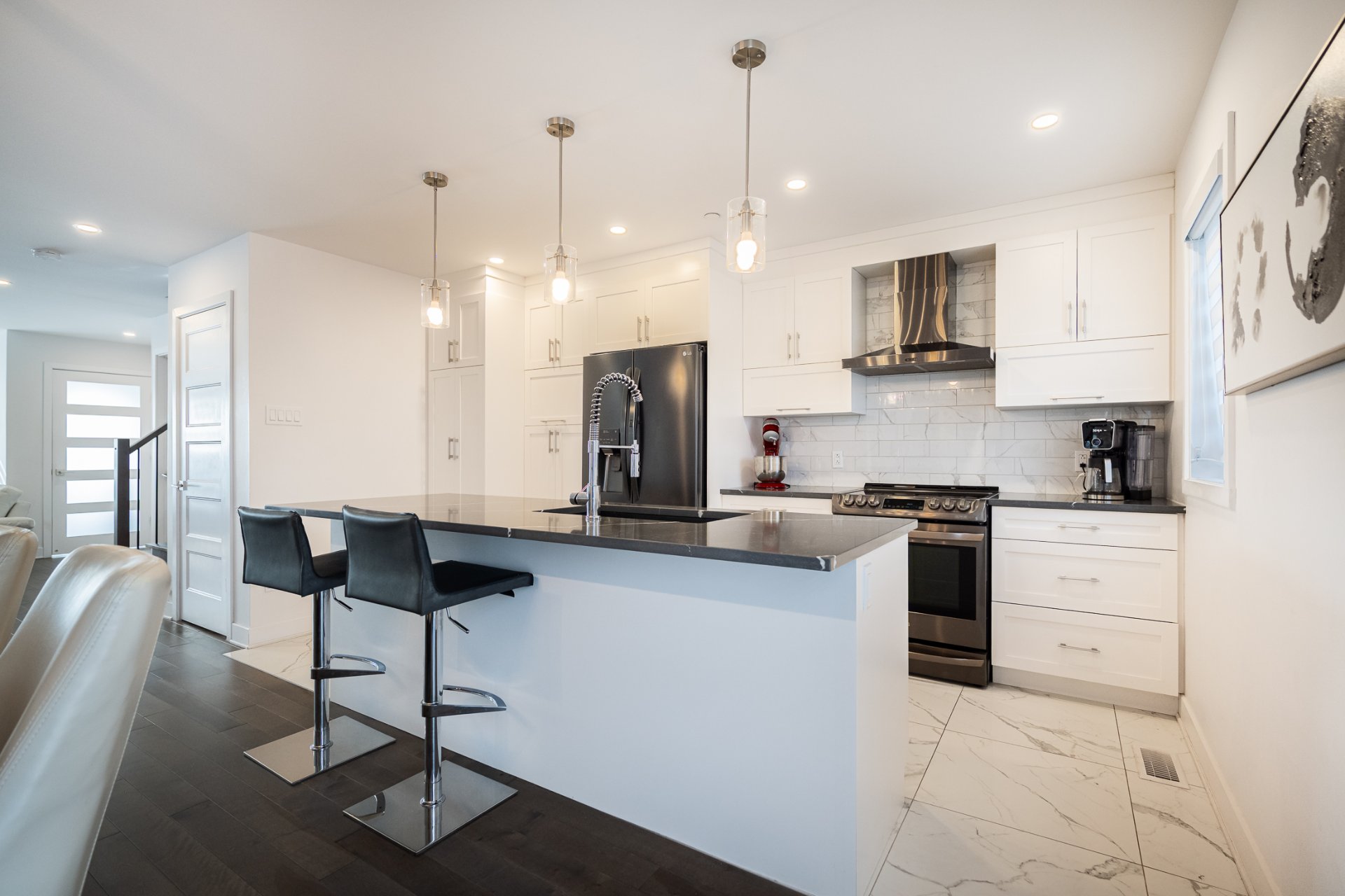 Beautiful modern 3-storey townhouse with finished basement and private double garage, built in 2019. Offers 3 spacious bedrooms, 2 full bathrooms plus powder room, separate laundry room and open-concept living filled with natural light. Elegant kitchen with black quartz island, hardwood floors and high-end finishes throughout. Large terrace with spa overlooking park and baseball field. Central heat pump, air exchanger, central vacuum and sprinkler system. Ideally located near the A25 bridge, schools, shops, cafés, parks, gym and all essential services in peaceful RDP by the river.