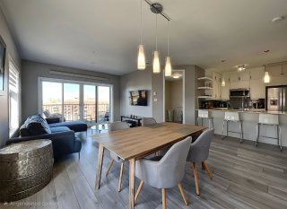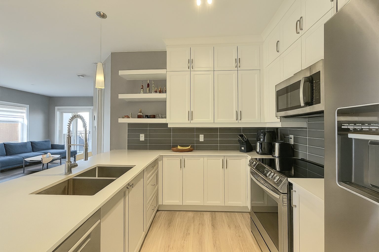 sophistication. The bright open-concept living area