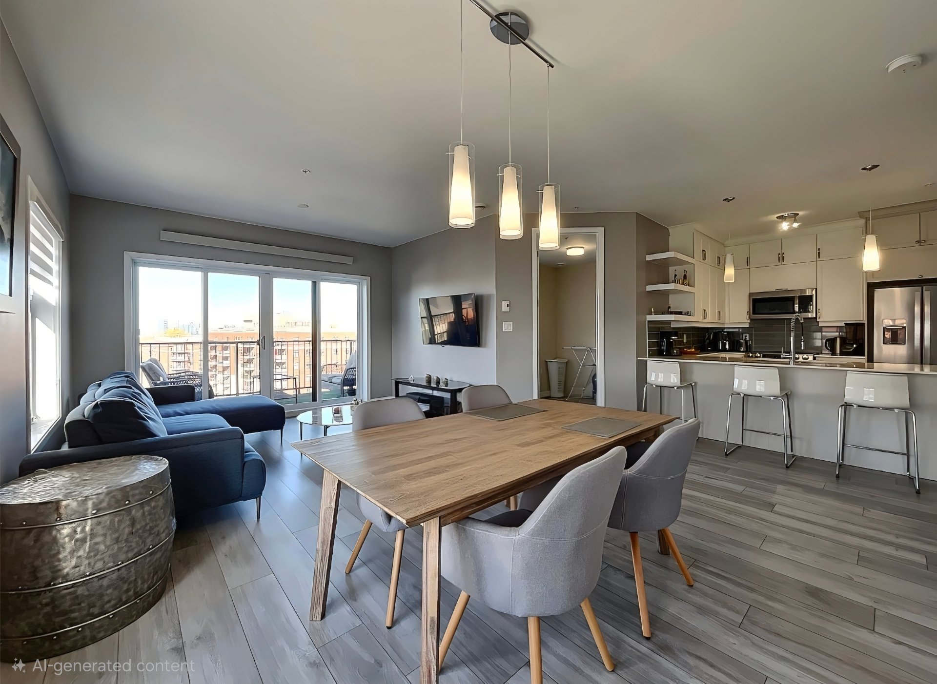 living room and dining area with a sleek, contemporary