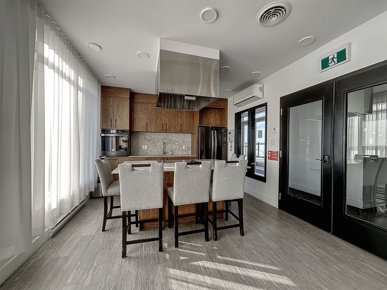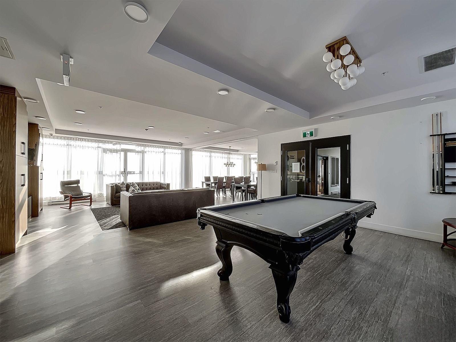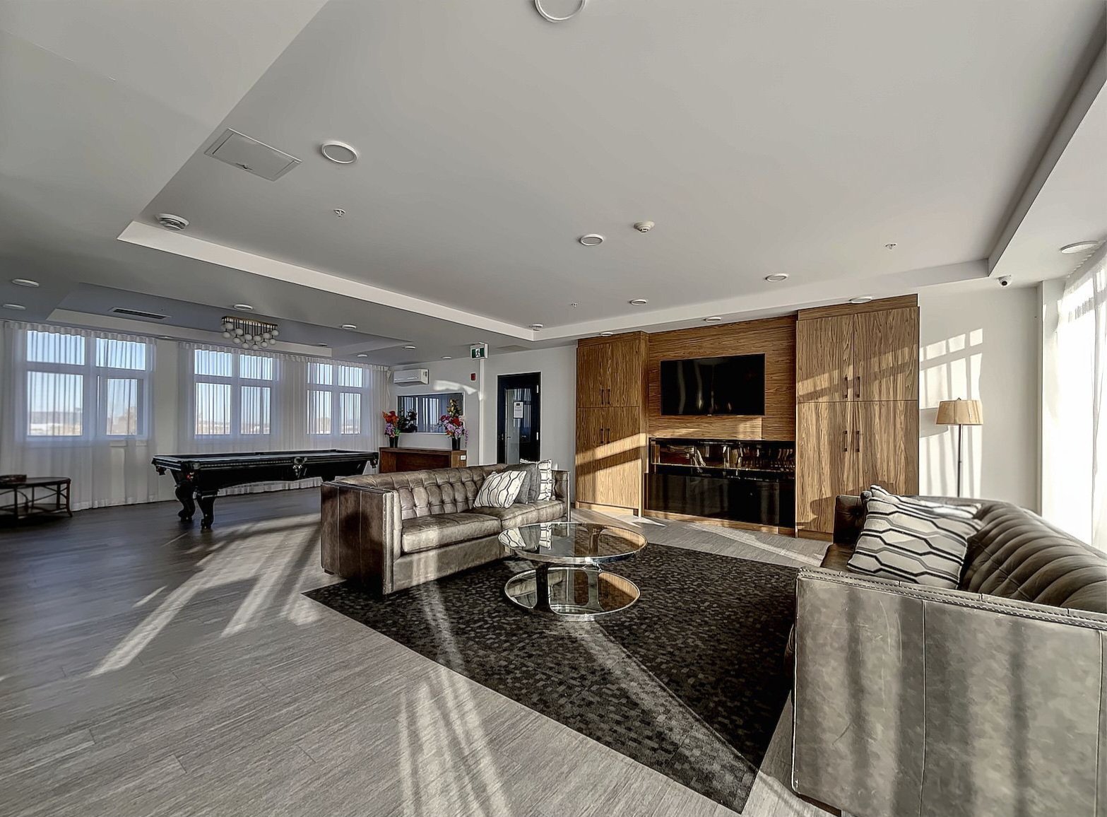 elegant residents' lounge with kitchen, a billiards table,