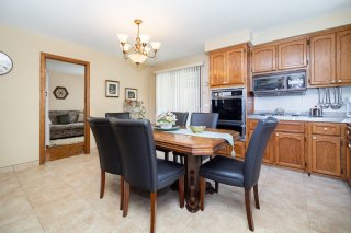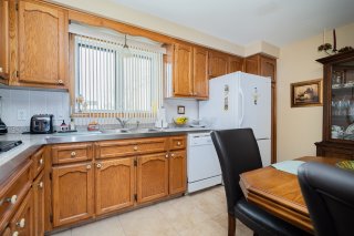 The main-floor kitchen features classic oak cabinetry with abundant storage and workspace. Ceramic flooring has been redone on both levels, adding durability and a clean, refreshed feel. The layout is practical and thoughtfully designed for daily living while maintaining a welcoming atmosphere.